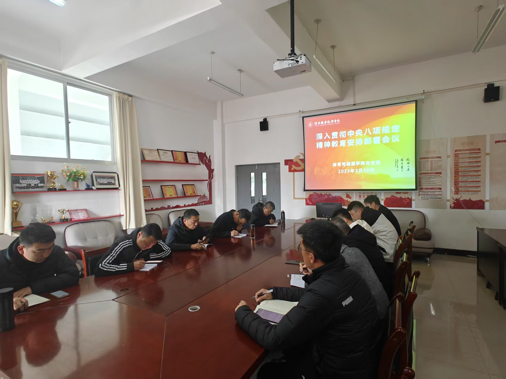 2025年3月20日,体育与健康学院党支部召开会议,深入学习并部署中央八项规定精神的落实工作。会议由党支部书记周小刚同志主持,全体党员教师参加。