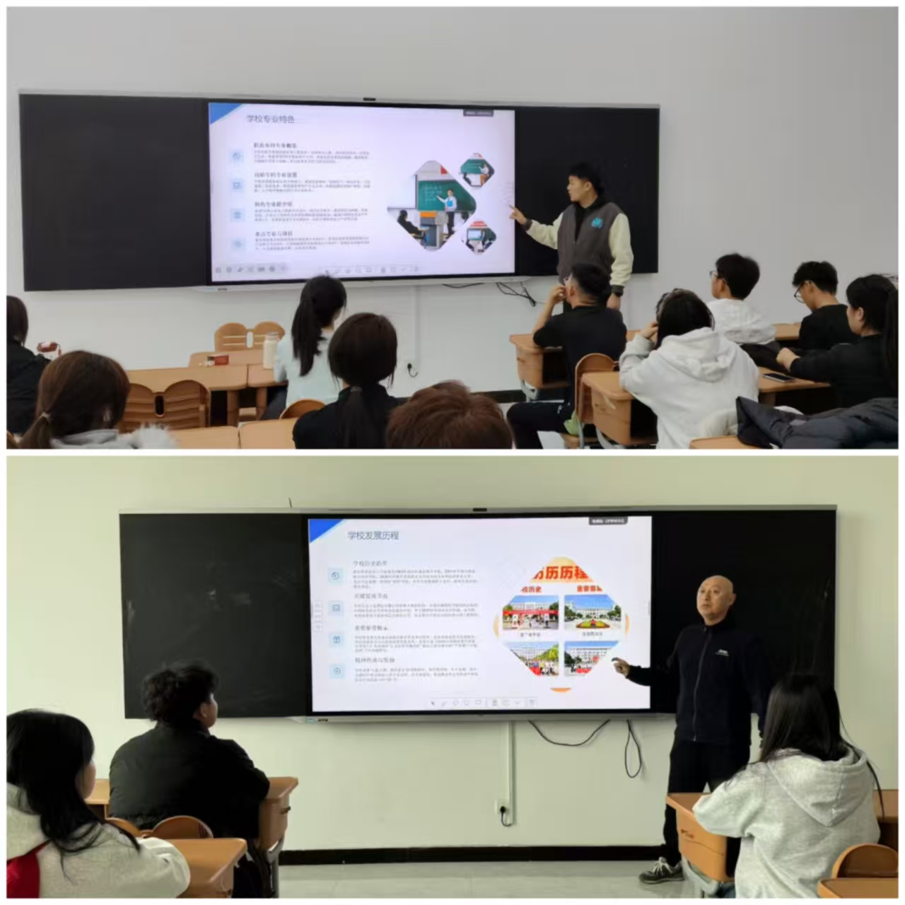 班会中,师生共同回顾了学校四十余年办学历程与“双高”建设、升格职业本科的重要成就,详细介绍了学院专业特色、师资力量、产教融合及校企合作成果,展现了校院深厚的文化底蕴与强劲的发展实力。同时,结合班级建设实例,阐释了班集体与校院发展的紧密联系,明确了校荣我荣、院荣我荣、班荣我荣的深刻内涵,号召学生以实际行动维护集体荣誉。