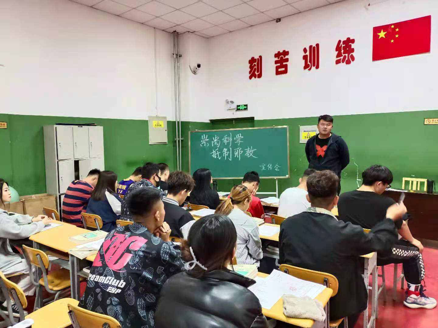 2021年4月20日晚,体育与健康学院健身指导与管理班全班27同学,在班主任常鑫的带领下,召开了“崇尚科学,抵制邪教”的宣传会。