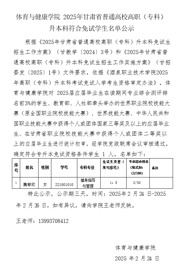 体育与健康学院2025年甘肃省普通高校高职(专科) 升本科符合免试学生名单公示